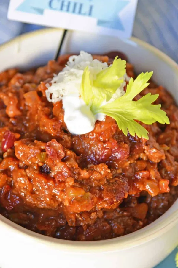 Blue Ribbon Award Winning Chili packs a punch with beef, sausage, bacon, and hearty vegetables.
