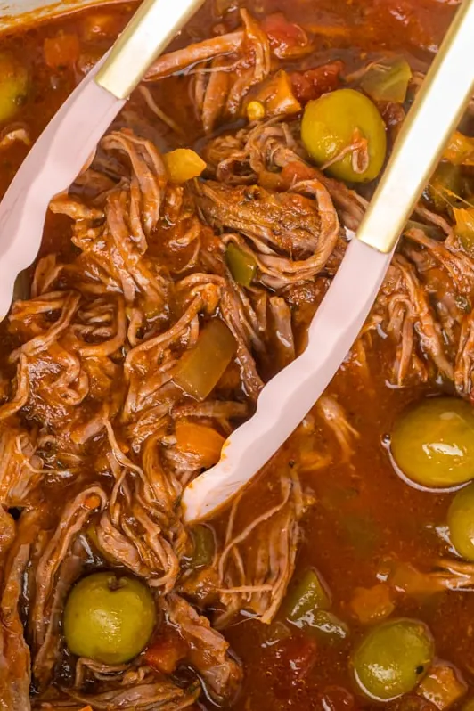 Slow Cooker Ropa Vieja features tender shredded flank steak in a zesty tomato-based sauce.