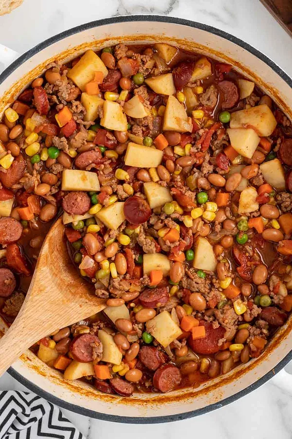 Cowboy Stew is a one-pot favorite loaded with ground beef, kielbasa, beans, and potatoes.