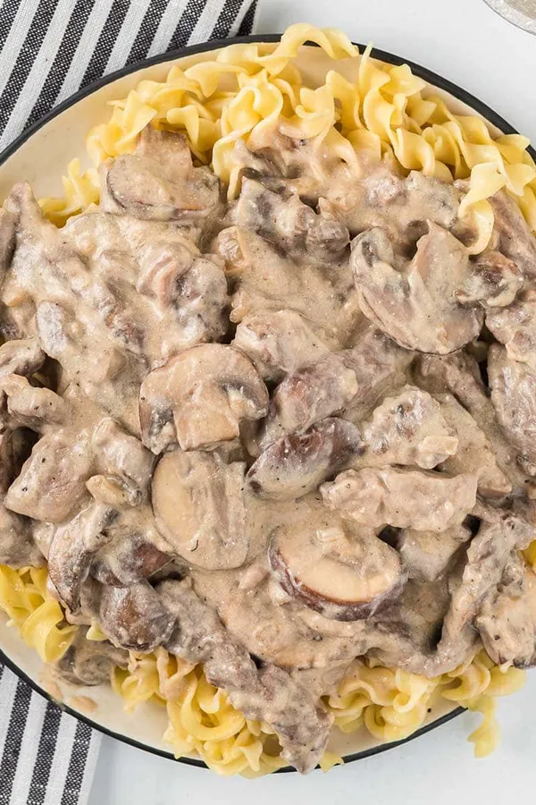 Tender beef in a creamy sauce, served over soft egg noodles.