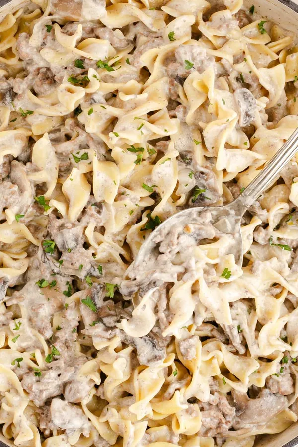Ground Beef Stroganoff combines tender ground beef and mushrooms in a rich, creamy sauce that pairs perfectly with egg noodles.