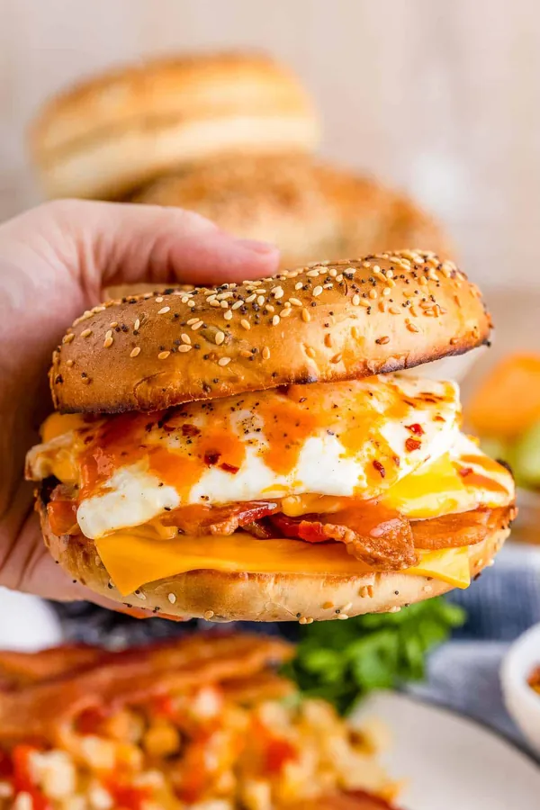 The Bagel Breakfast Sandwich gives you crispy bacon, jammy eggs, and melty cheese on a toasted bagel.