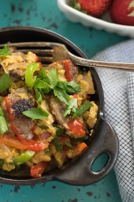 Loaded with bratwurst, peppers, and eggs, it’s ideal for anyone who loves a big, filling breakfast.