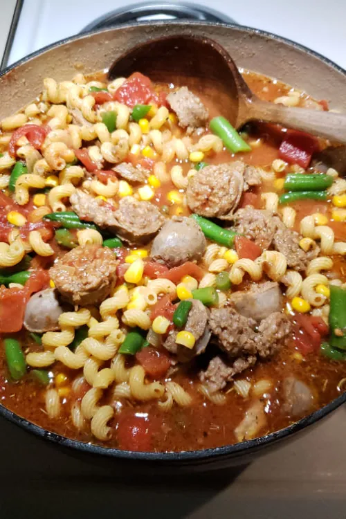 It includes tender Italian sausage, green beans, corn, and pasta in a savory broth.
