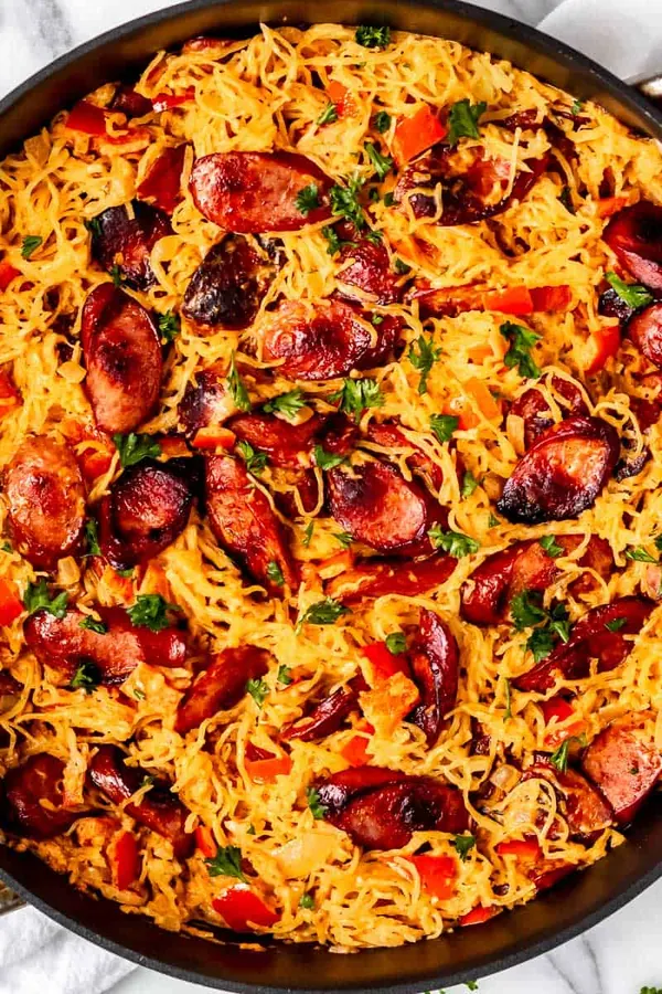 Italian Sausage Spaghetti Squash Skillet brings together savory sausage, colorful peppers, and tender squash in a creamy sauce.