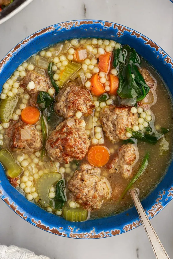 It’s packed with tender meatballs, greens, and small pasta in a rich broth.