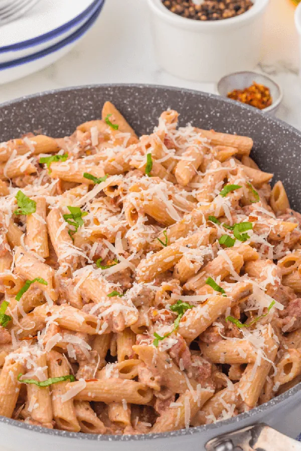 Creamy tomato sauce wraps around penne pasta and savory Italian sausage for a satisfying one-pot meal.