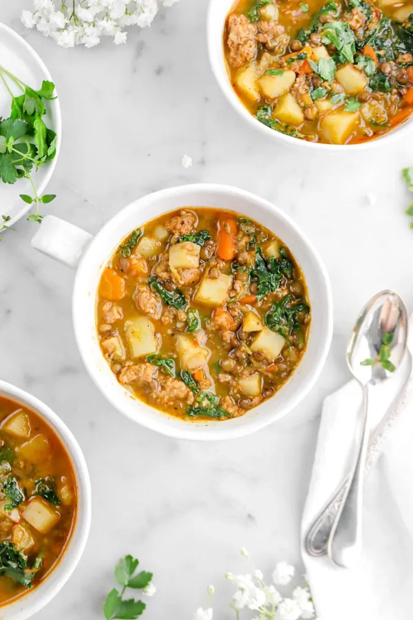 Vegan Italian Sausage, Lentil, Kale, and Potato Soup delivers big flavor in every bowl with lots of heartiness and texture.