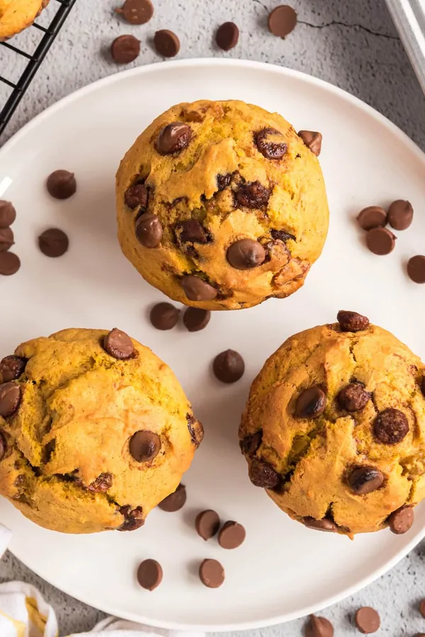 Chocolate chip pumpkin muffins are warm, moist, and spiced with classic fall flavors.