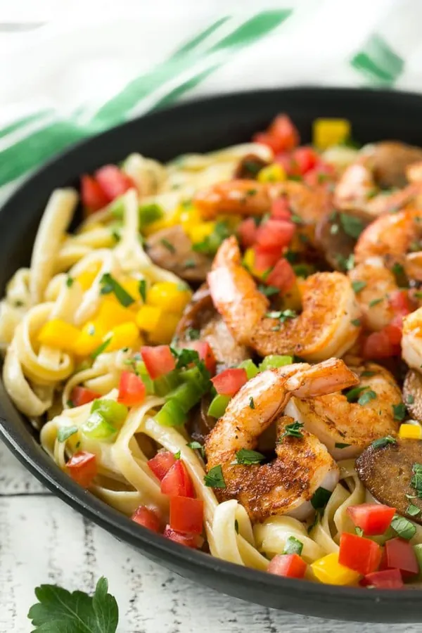 Hearty smoked sausage, juicy shrimp, and vibrant veggies mix perfectly with creamy pasta.