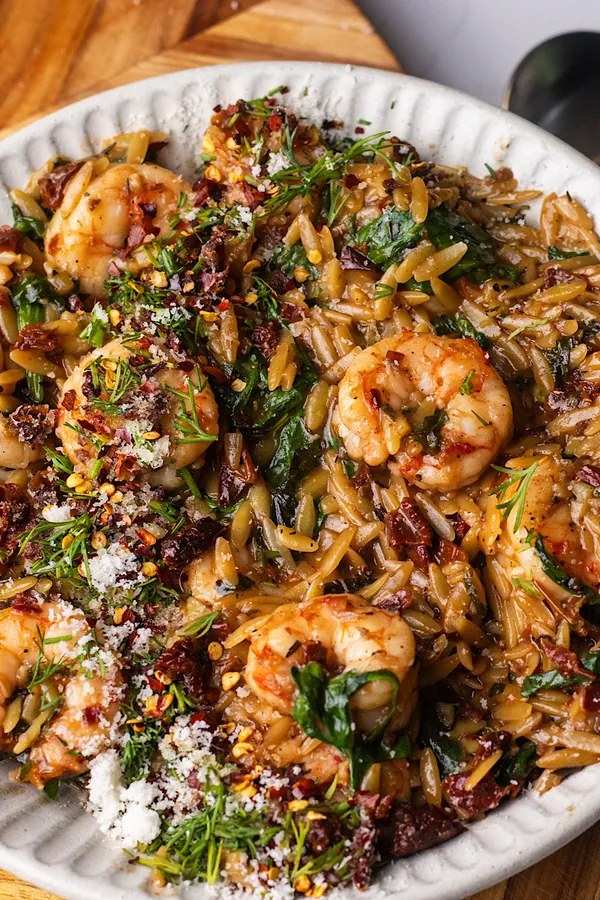 1. Lemon Garlic Shrimp with Spinach, Pine Nuts, Sun-Dried Tomatoes, and Orzo