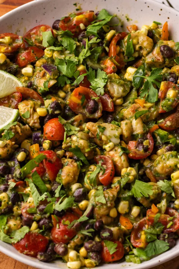 Shrimp Taco Salad with Cilantro Lime Dressing combines juicy shrimp, crisp lettuce, and a zippy lime dressing.